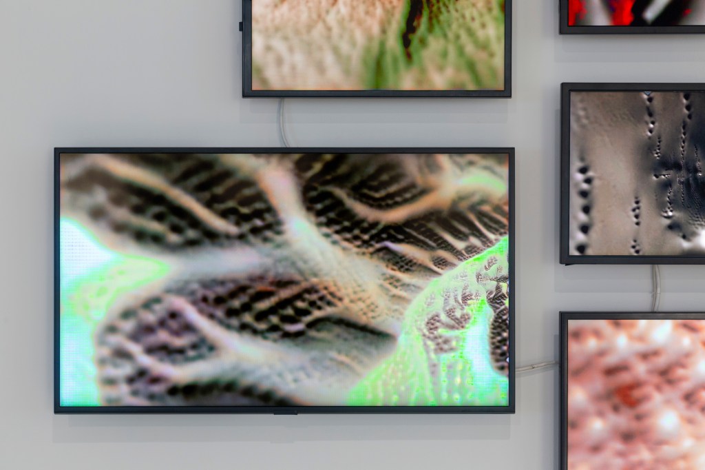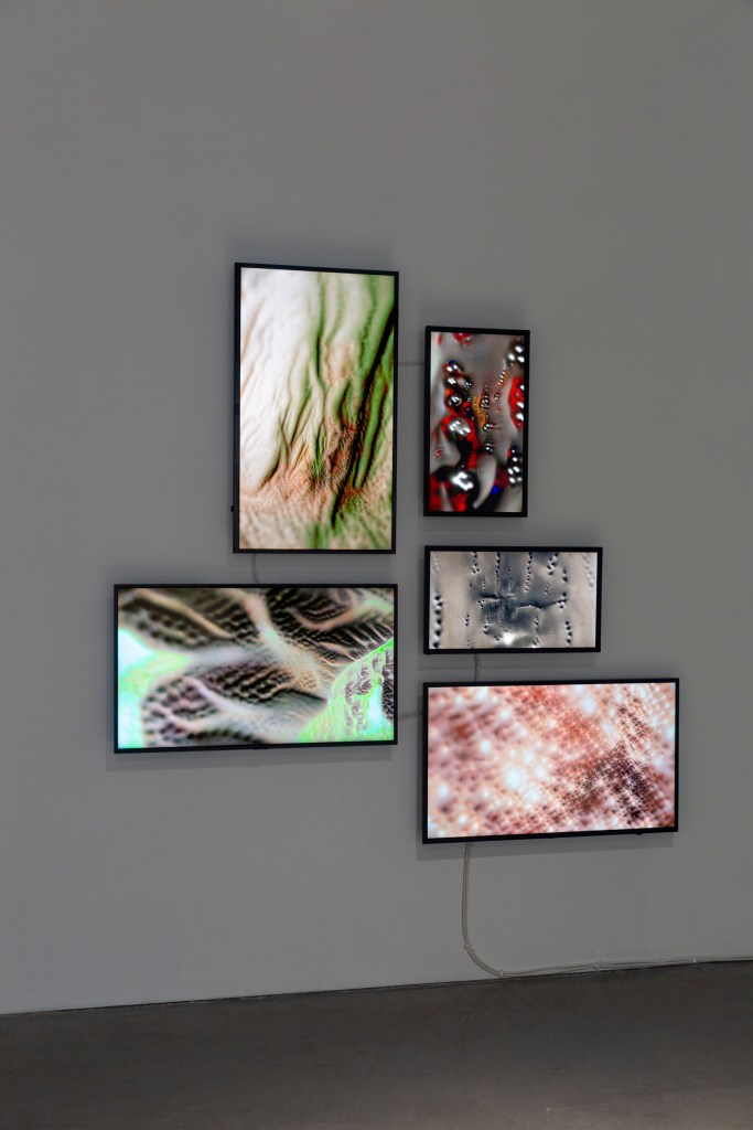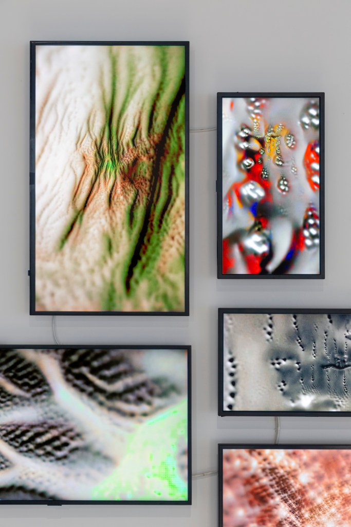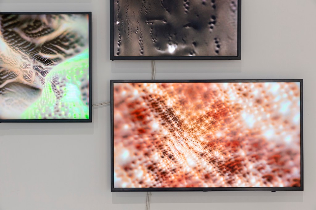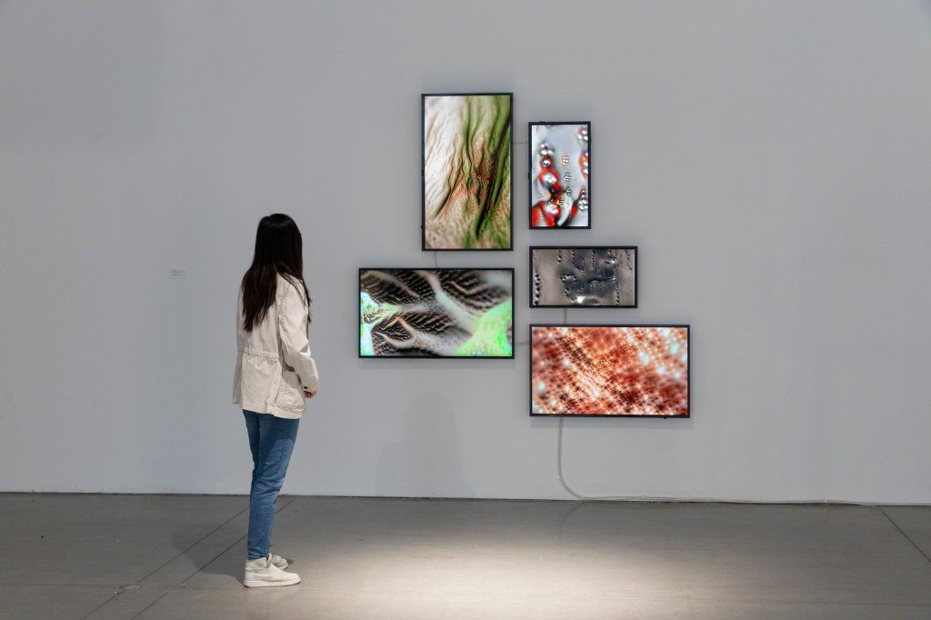 石 (Rock), 财 (Wealth), 壶 (Kettle), 笔 (Writing brush), 松 (Pine) is a video installation that references the tradition of East Asian ‘still life’ paintings. Five categories of objects and plants with symbolic significance in East Asian culture were depicted in the work. To create the video, thousands of photographs of the five objects and plants were taken. Those images were processed and trained on with an image classification neural network (VGGNet60). The resulting small images were combined through enlarging and blending to form a higher resolution image. The larger images are then recolored through Pix2pix, a Generative Adversarial Network (GAN). Finally, the recolored images were interpolated between frames to form the video.